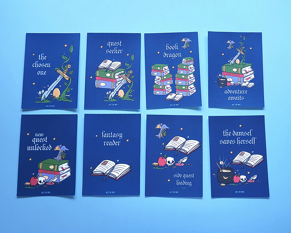 Conjunto de 4 Postais + Conjunto de 8 Postais, cada conjunto é embalado nos respectivos envelopes.