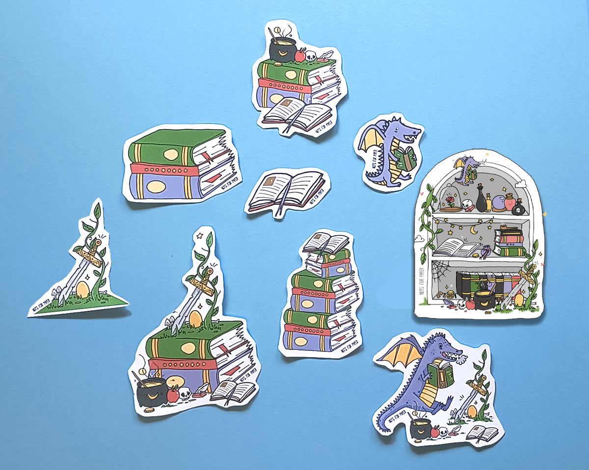Autocolantes ilustrados com livros e dragões em fundo azul claro