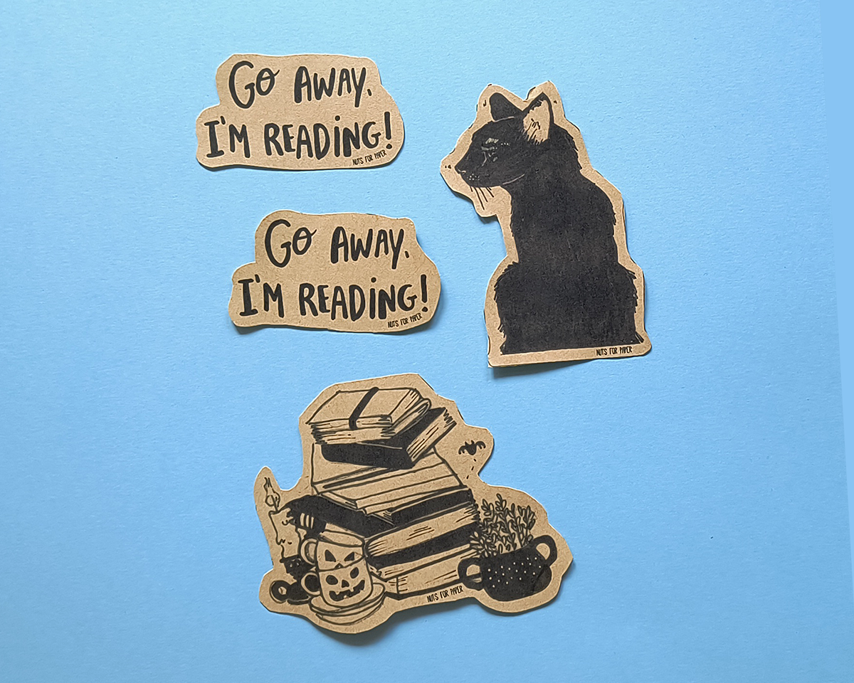 2 - Conjunto de 4 Autocolantes (2 Go Away, I'm Reading; 1 Gato; 1 Pilha de Livros).